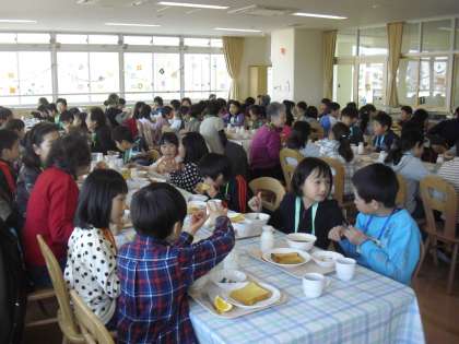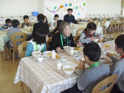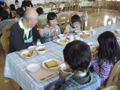 会食の様子です。普段から子どもたちを見守ってくださっている地域の方々は、子どもたちと言葉を交わしながら、昔の学校や地域の様子や昔の遊び等について話をしてくださいました。