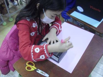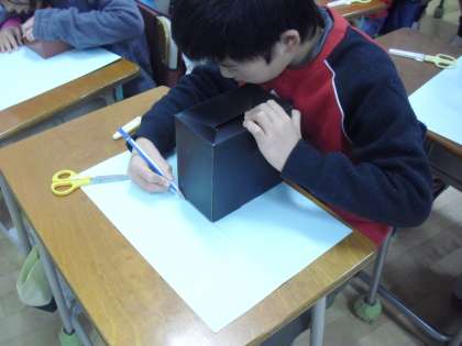 2年生の算数の授業の様子です。箱の形を学習しているところです。箱は面がいくつあるのか、箱の形によって面の大きさは異なるのか等を学びます。自分がもってきた箱の各面を色画用紙に写していきます。箱のしくみに迫ります。