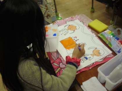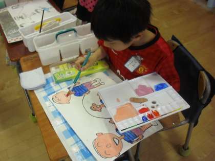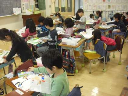1年生の図画工作の授業の様子です。この1年間で楽しかったこと、うれしかったことを思い出して描く「にっこりニュース」に取り組んでいるところです。文字通り、画用紙には子どもたちの笑顔がたくさん見られます。絵の具の使い方も上手になりました。