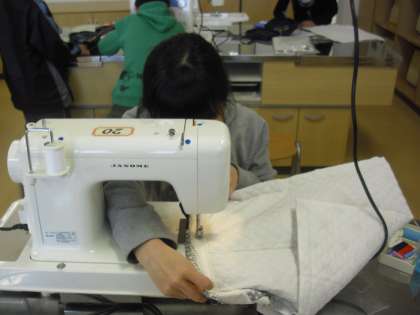5年生の家庭科の授業の様子です。生活に役立つものの製作に取り組んでいるところです。ナップザックかトートバックを選んでいます。失敗しても丁寧に糸をほどいてやり直したり、友達に教えてもらったりしながら進めています。