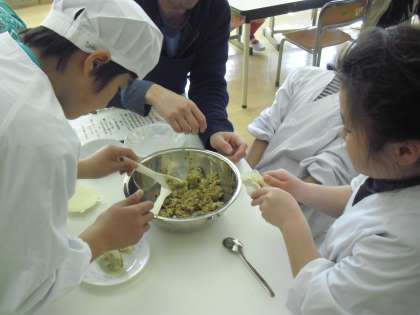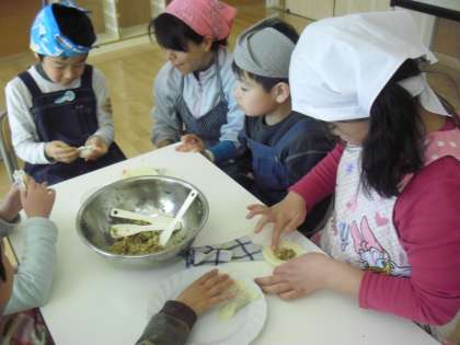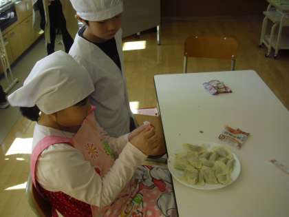ひかり学級の調理実習の授業の様子です。今回はギョウザづくりに取り組んでいます。具を皮に包んでいるところです。具が出ないようにしっかりと包みます。一つできあがる度にうれしそうな表情を浮かべる子どもたち。焼き上がりが楽しみです。