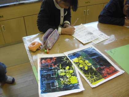 4年生の図画工作の授業の様子です。刷り上がった版画「ふしぎな花」の学習の振り返りを行っているところです。版画を前に、これまでの取り組みについて自己評価をします。単に感想を述べるのではなく制作過程をよく思い出しながら学習の総括をします。このような活動の積み重ねが評価する力を高めます。