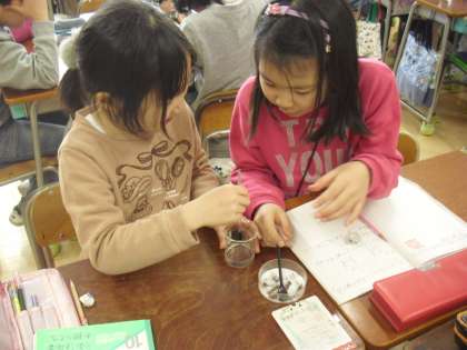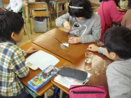 3年生の理科の授業の様子です。水の重さと、水に食塩を溶かした水の重さを比べる実験をしています。電子計量器で正しい重さを測定します。一人一人が実験ができるように2〜3名で活動しています。実験の主体者となることで意欲も高まります。