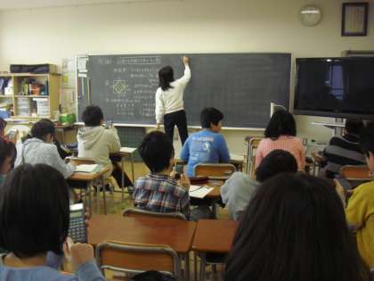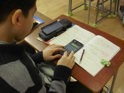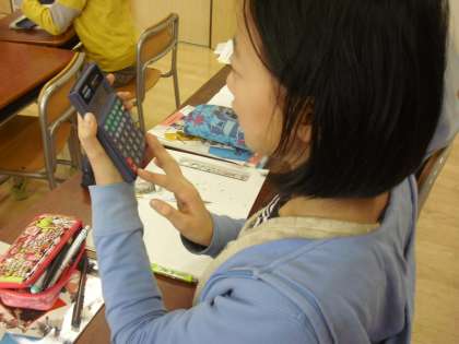 6年生の算数少人数指導の授業の様子です。面積が2平方センチメートルになる正方形の1辺の長さを考えているところです。1辺をXと考えて、X×X=2という立式は容易にできますが、Xの数がいくつになるのか、電卓を使って見当をつけています。1では成り立たないので、子どもたちは2に近い小数を当てはめながら計算しています。