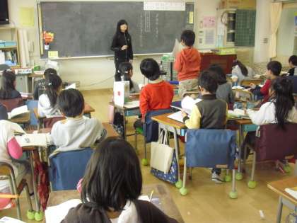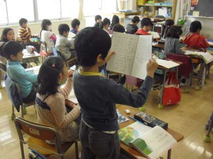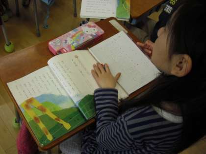 1年生の国語の授業の様子です。単元「夕日のしずく」を読み、感じたことを発表しているところです。この学習は様子を思い浮かべながら読むことが中心の課題です。子どもたちはノートに書いた感想を進んで発表しています。自分の言葉で伝える活動です。