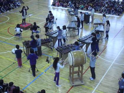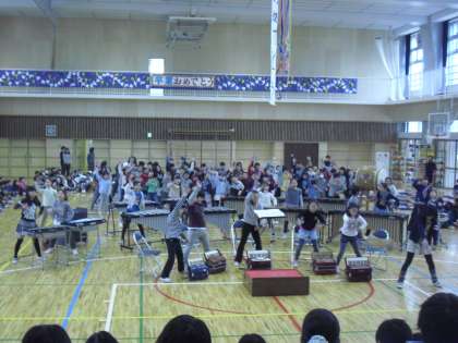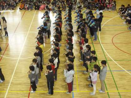 在校生からの贈る言葉と演技です。まずは4年生。6年生も4年生のときに踊った「ソーラン節」を元気いっぱいに披露しました。2分の1成人式で発表した「ソーラン節」の合奏も行いました。4年生の感謝の気持ちが伝わった表現でした。4年生は体育館入り口やギャラリーの装飾に使われている風船の制作もしました。