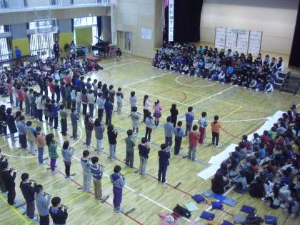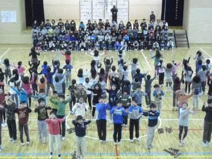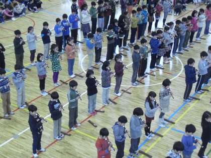 3年生は、新校舎の入室合図の音楽にもなっている「エーデルワイス」のリコーダー演奏を披露しました。その後は、流行歌の替え歌を振り付きで歌いました。歌詞は、「6年生ありがとう 感謝をこめて」です。元気いっぱい歌い踊った3年生。感謝の気持ちを伝えることができました。