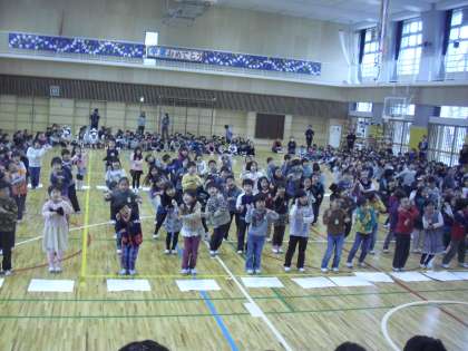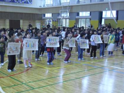 1年生は、大好きな仲良しパートナーさんの6年生にダンスと替え歌で感謝の気持ちを伝えました。「運動会」「展覧会」「大縄大会」「中休み」「昼休み」「給食」・・6年生との思い出を歌います。「100パーセント大好き」と一生懸命に歌う1年生に感極まる6年生の姿も見られました。