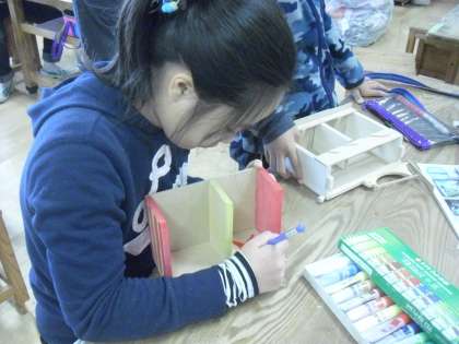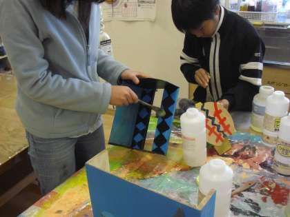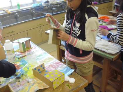 6年生の図画工作の授業の様子です。木工作品「一枚の板から」の制作も仕上げの段階になりました。色を付けたり、ニスをぬったりと仕上げの作業をしています。子どもたちは自分の作品には愛着をもっているのでとても作品を大切にあつかいます。