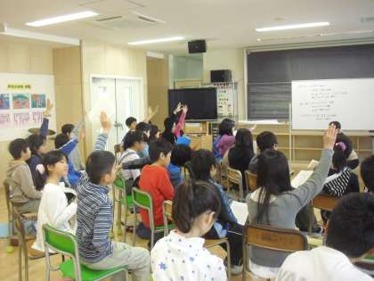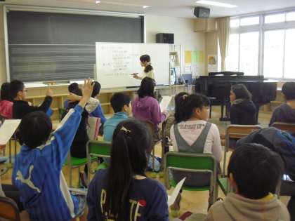 5年生の音楽の授業の様子です。卒業式で歌う曲「そのままの君で」の歌詞の意味について全員で考えているところです。歌詞の意味を理解し、言葉を大切にして歌うことで、気持ちをこめて音楽表現することにつながっていきます。