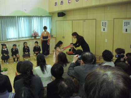 施設一体型の一部である八幡山保育園の卒園式の様子です。渡部校長も出席し子どもたちを見守りました。一人一人が池田園長先生から卒園証書をいただきます。礼儀正しく礼をして堂々とした態度です。自分の番を待っている間も、きちんと座って待つことができ立派でした。4月から本校に入学する子もいます。卒園おめでとうございます。