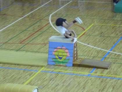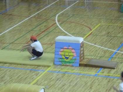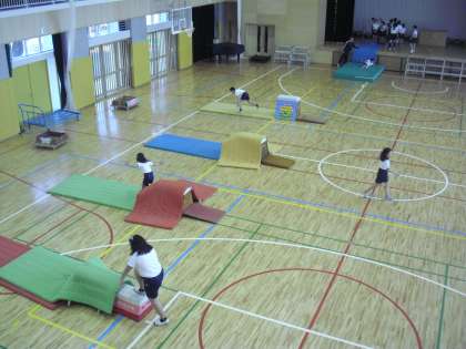4年生の体育の授業の様子です。器械運動「跳び箱運動」に取り組んでいるところです。今日は「台上前転」を行っています。文字通り跳び箱の台上で前転をする技です。複数の動作のタイミングを合わせることが求められます。上手に習得している児童もいます。