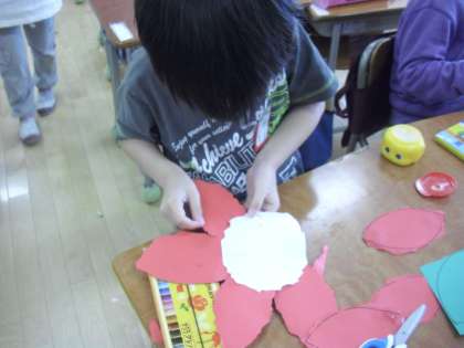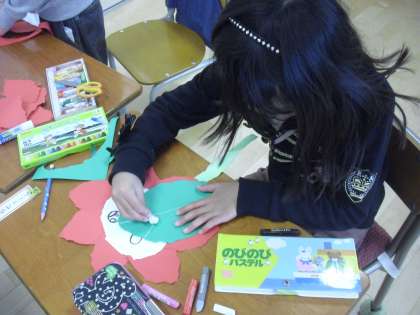 1年生の図画工作の授業の様子です。新1年生の教室に飾るお花を作っているところです。花びらを手でちぎっていきます。のりで貼り付けて大きなお花を作ります。このような活動を通して進級への意識も高まります。