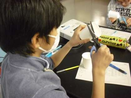 わからなかったら動いてみるが、三谷流。トップカールと上げ底の部分を切りとって、ある物とない物とを比べます。比べるためには、実際に水を入れてみて使ってみることです。三谷先生は体験したことから考える大切さを教えてくれます。