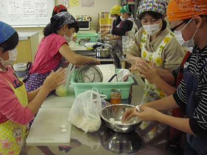5年生の家庭科の授業の様子です。調理実習で「フルーツ白玉」を作っているところです。グループで協力して、丸い白玉を作ったり、フルーツを切ったりしています。計画表を見ながら作業を進めます。