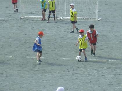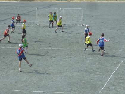 3年生の体育の授業の様子です。サッカーのゲームをしているところです。ゴールを2つ並べて得点が入りやすいように工夫しています。授業を重ねるにつれ、足でのボールの操作も上手になってきました。