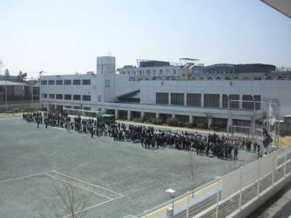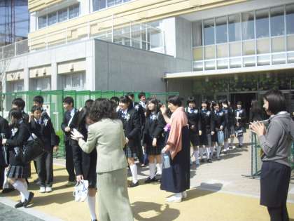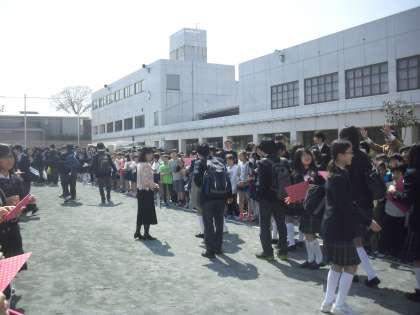 今日は芦花中学校の卒業式です。式を終え、校庭で中学3年生を見送ります。中学3年生が6年生のときに1年生だった小学4年生、そして6年生も見送りの列に加わります。その他の学年も窓やテラスから「おめでとう」と手を振りながら見送っています。