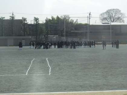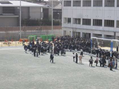 合同音楽朝会ですばらしい歌声を聴かせてくれた中学3年生。いつまでも校庭でなごり惜しそうに仲間と過ごしています。新校舎落成・創立50周年記念式典でいっしょに歌ったことを忘れません。卒業おめでとう。
