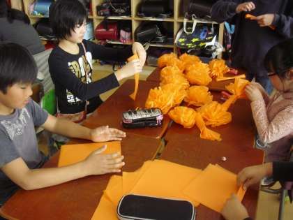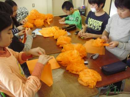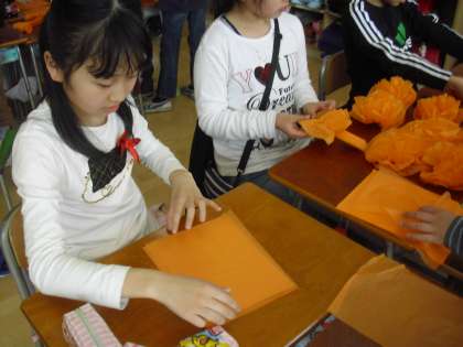 4年生の学級活動の授業の様子です。花紙で、新1年生の教室の装飾に使う花を作っているところです。4月からは高学年の仲間入りをする4年生。このような仕事にかかわることで高学年としての意識を高めていきます。