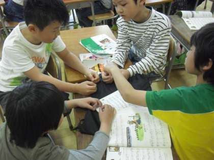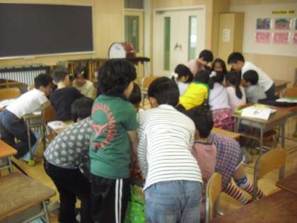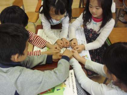 2年生の音楽の授業の様子です。「ずいずいずっころばし」をみんなで楽しく歌っているところです。友達と輪になって手を真ん中に寄せて遊んでいます。子どもたちには昔から歌い伝えられてきた日本の民揺や童揺をたくさん知ってほしいと思います。これも日本の大切な文化です。