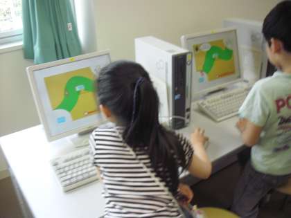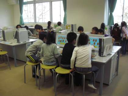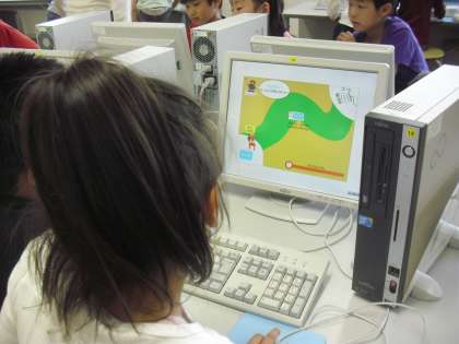 1年生の生活科の授業の様子です。パソコン室でソフトを使ってマウスの操作の仕方を学んでいるところです。子どもたちがマウスで主人公をクリックしたり、ドラッグしたりしながらゴールまで運ぶゲーム感覚の内容です。すぐに操作の仕方を覚え楽しむことができました、