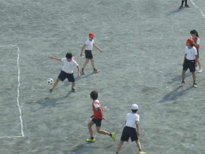 サッカーの様子です。半面でも十分な広さが確保できる校庭で思いっきり走って楽しんでいます。ゲームを運営するのも高学年では大切な学習内容の一つです。自分たちで審判も行いゲームを進めています。