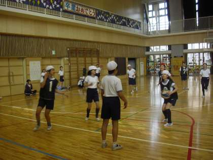 体育館では、バスケットボールを行っています。男女・学年混合チームでトーナメント形式でゲームを行っています。ハンドボール、サッカー、バスケットボールと自分の好きな種目にエントリーし、交流を深めています。