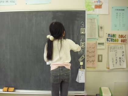 2年生の大掃除の様子です。机を移動させて、ゴミをはいて雑巾でふき掃除をします。黒板もきれいにしています。流しでは、金魚の水そうを一生懸命に洗っています。1年間お世話になった教室に感謝の気持ちをもって取り組んでいます。