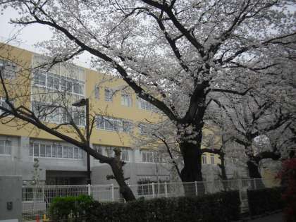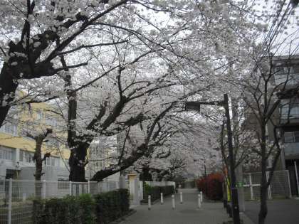 芦花小学校・芦花中学校の桜が満開を迎えています。北門から遊歩道を歩いてみました。曇り空ではありますが、桜のアーチが遊歩道を桜色に染めています。桜の木々の間から校舎カラーのクリーム色が鮮やかに映っています。