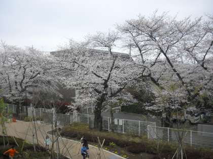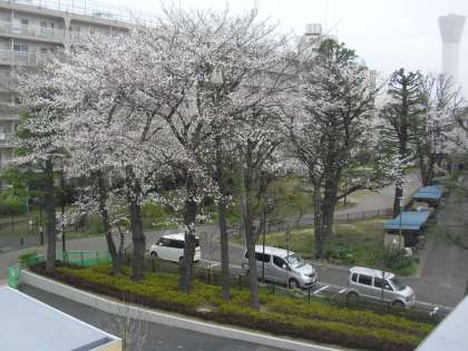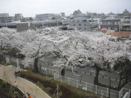 上の写真は4階の多目的室から見た桜の様子です。まさに遊歩道が桜ロードのように見えます。真ん中の写真は、3階の図工テラスから見た桜です。下の写真は、図書テラスから見た遊歩道の桜です。明日の卒業式も桜の花が見守ってくれます。