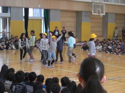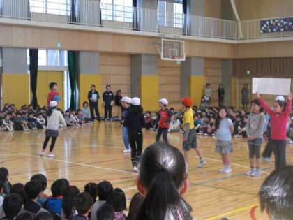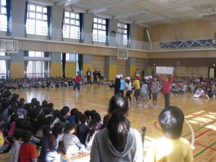 迎える会、一番手は4年生の学校紹介・休み時間編です。