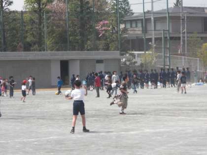 校庭で遊ぶ隣では、中学生が体育の学習をしていました。
