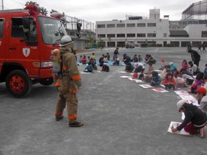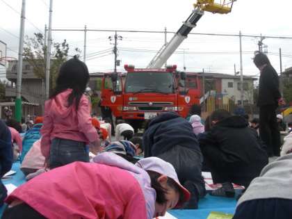 千歳の消防署から消防士の方々とはしご車を招いて写生会です。