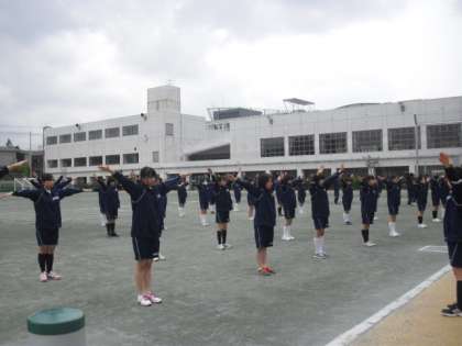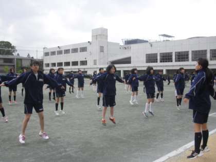 芦花小学校は、小学校中学校施設一体型の校舎で、校庭でも一緒に授業が行われています。校長室から外を見ると、中学生が、ラジオ体操をしていました。あまりにきちんと整列し、手先をぴんと伸ばしている美しいすがたにひかれ、校庭へ行き見学・・・