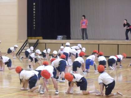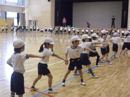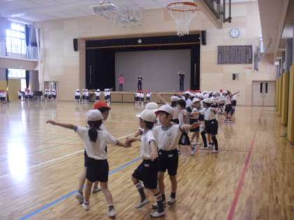 低学年も負けてはいません。2年生は忍者になりきって、隊形変化しながらの練習です。