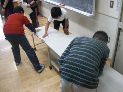 「こうすると給食台の汚れがきれいに落ちるんです。」と