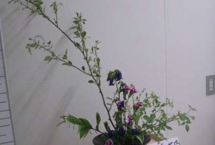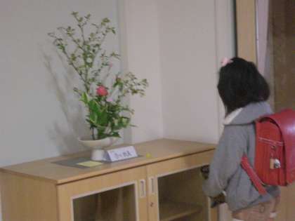 中学校華道部の作品が、毎週新しく活けられ、飾られています。