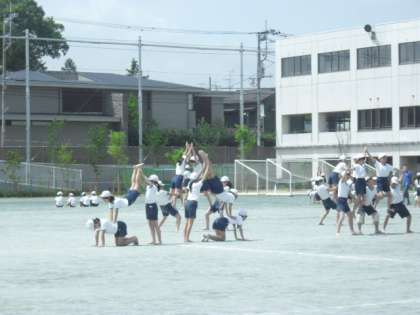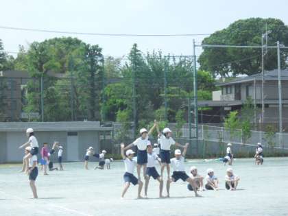 校庭で、組体操練習です。今日は、4人、6人と組になっての技の練習に取り組んでいました。