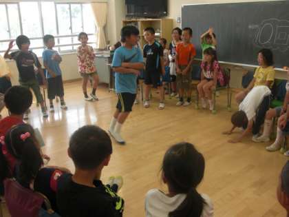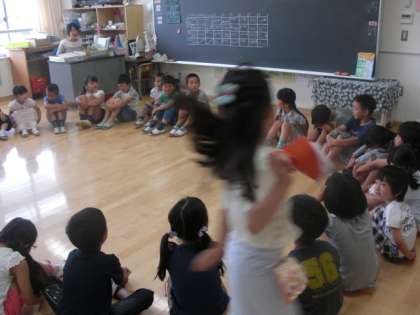 2年生の山田学級では、伝統的「ハンカチ落とし」(写真:中)