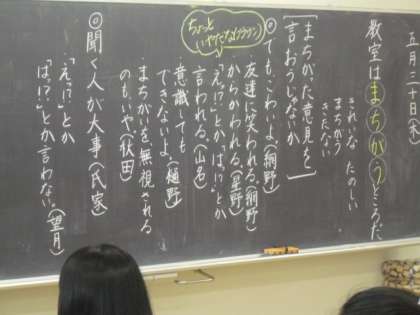 互いの意見をを温かい姿勢で受け入れ、笑顔あふれるクラスにしていこうという心情を育てるため、「教室はまちがうところだ」の詩を題材に、子どもたちが意見交換をしながら今日の道徳の授業が進んでいました。