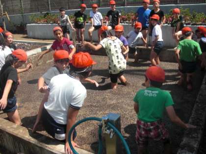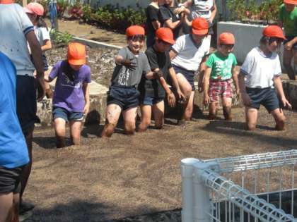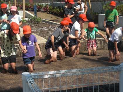 今日は、5年1組が社会科の学習で田んぼ作り。