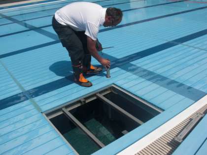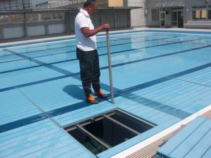 今日は、シーズンオフにプール床面を支えていた28本の支柱を抜く作業を