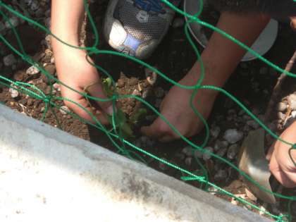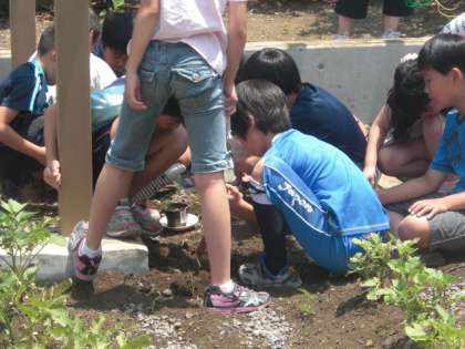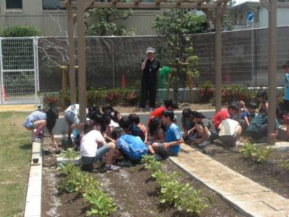 今日は4年1組長嶺学級が、ヘチマ棚の下の土を耕し、苗植えをしていました。