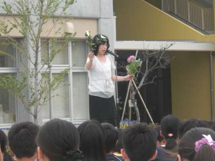 今朝の全校朝会、学校長の話は、地域の方にいただいたクチナシとアジサイの花の