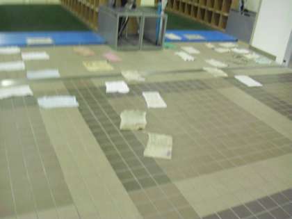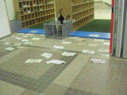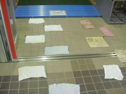 校内を巡回していて、中学校側の昇降口の入口に、2人の生徒が何やら雑巾を並べていました。「これは何?」とたずねると、今日の避難訓練に向けての準備でした。避難訓練ですから、合図と共に上履きで避難します。皆が戻って来て、すぐに上履きの裏の土を落とすことができるように、整美委員の2人が中学生の歩幅に合わせて雑巾を並べていてくれたのでした。細かな配慮に感謝です・・・・。