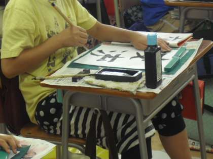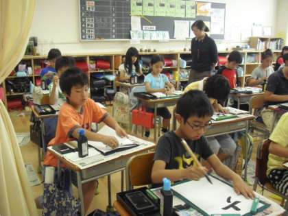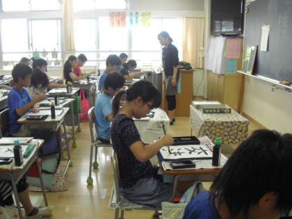 5年生の教室では、お習字をしています。今日は「交流」の文字です。