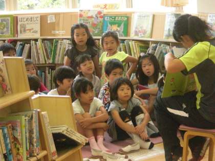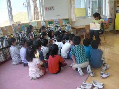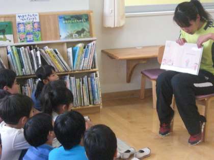担任の物井先生の読み聞かせを、ギュッと20名近くが固まって聞き入っていました。