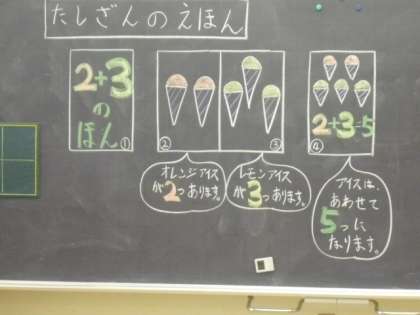 たし算の学習のまとめに、たし算のお話を考えて絵本作りです・・・