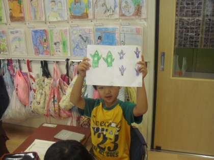 「はじめに○○が□ひきいました。」「後から△ひききました。」「全部で何匹になったでしょう」などとそれぞれが大好きなものを登場させて作っていました。