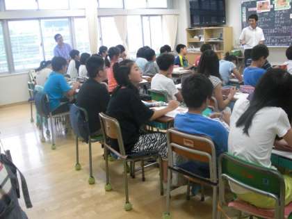 国語部会の授業は、1年4組の教室で、2組の真鍋先生が行いました。(写真:上)